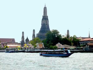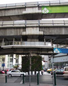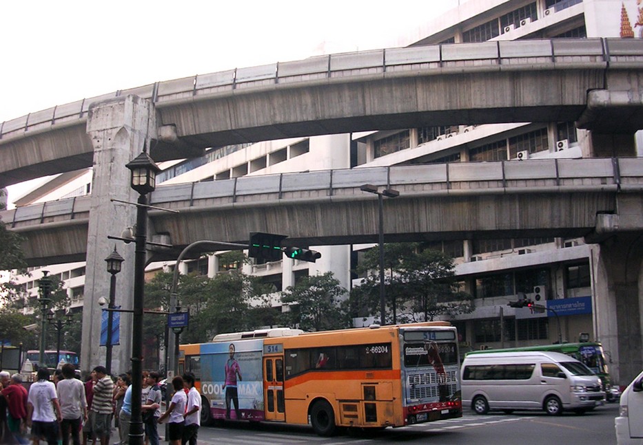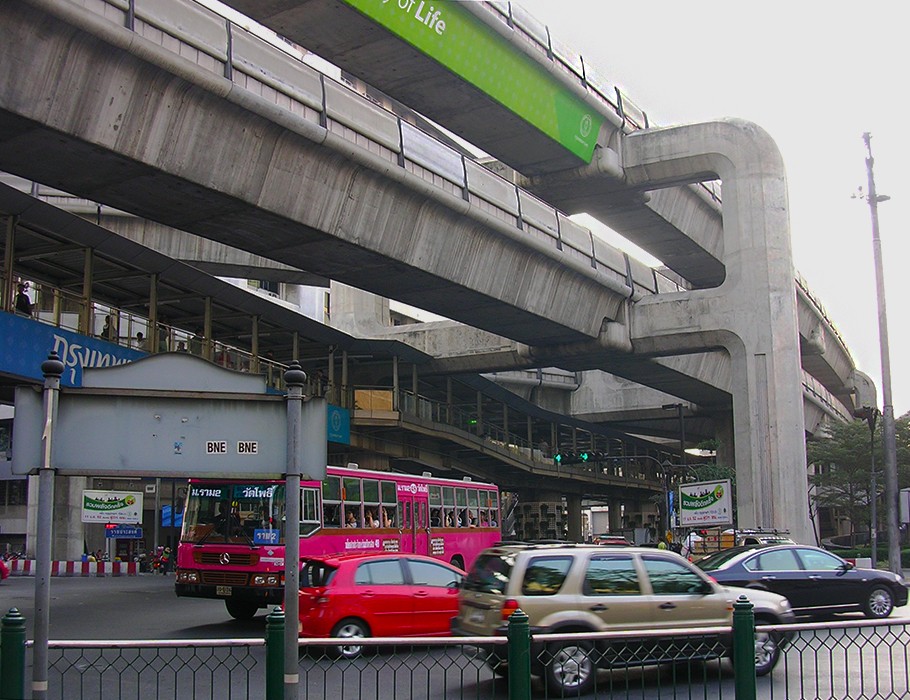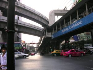 Po południu jeszcze spacer po mieście z naszą pilotką. Chodzimy po ulicach pełnych samochodów. Oglądamy z podziwem wspaniałe rozwiązanie komunikacyjne usprawniające ruch miejski – BTS Skytrain, czyli Nadziemna Kolej BTS. Ta dwukondygnacjowa nadziemna kolej miejska czynna jest codziennie od 6:00 do 24:00.Często kursujące, klimatyzowane pociągi to bardzo wygodny sposób poruszania się po mieście. Uruchomiona w grudniu 1999 roku stała się jednym z najważniejszych elementów infrastruktury transportowej w Bangkoku.
