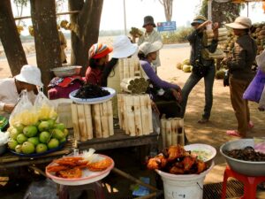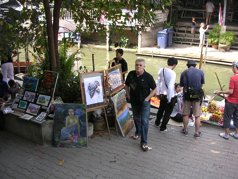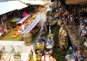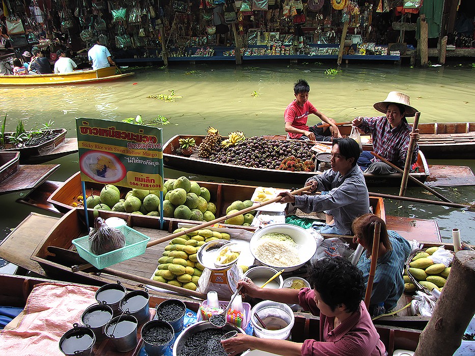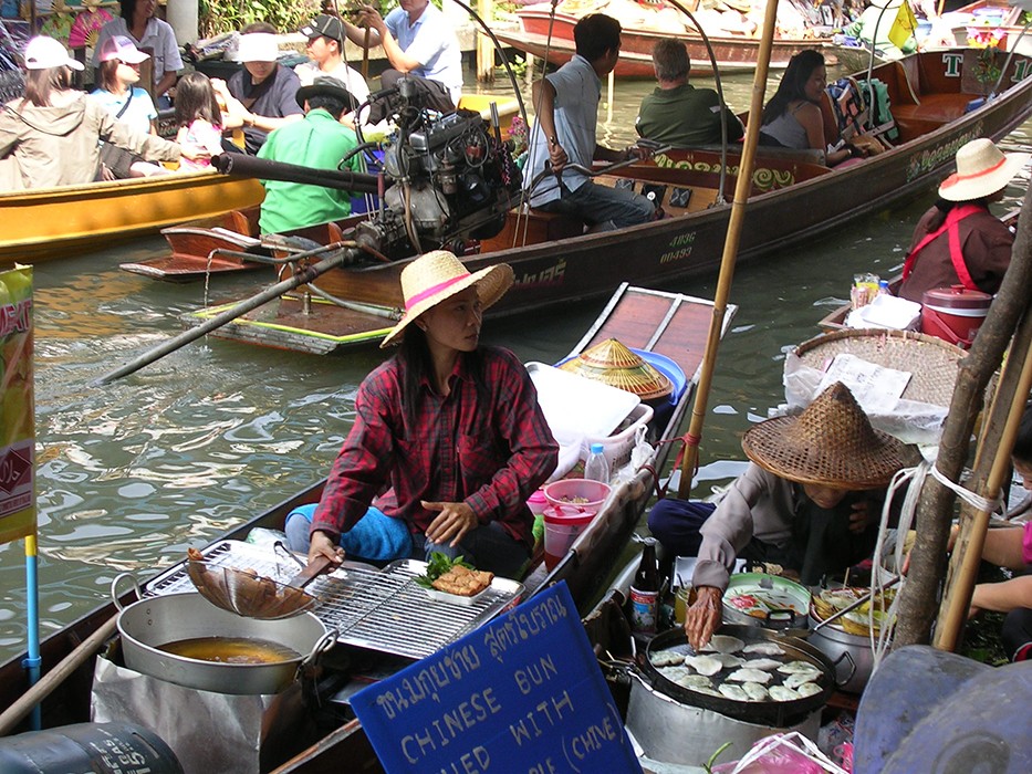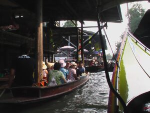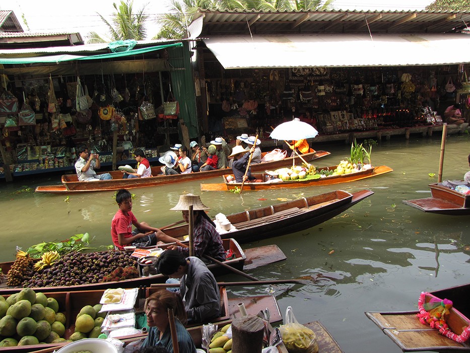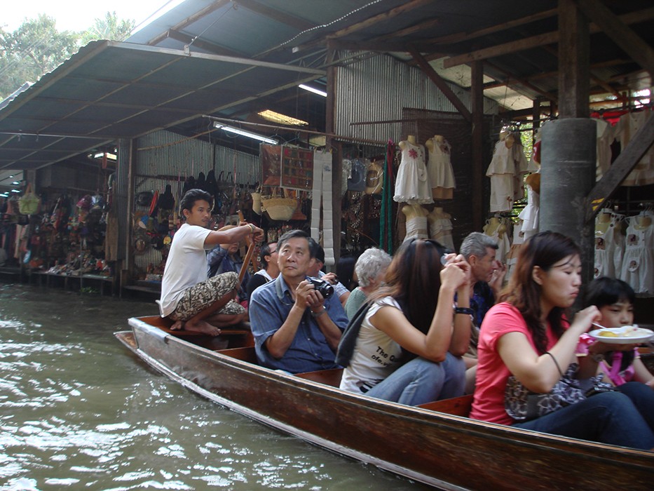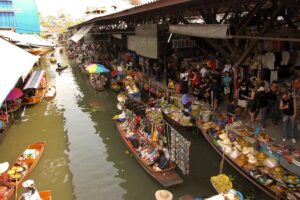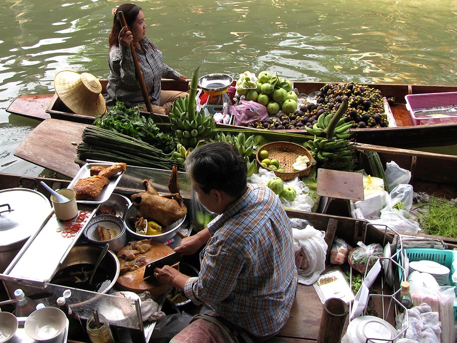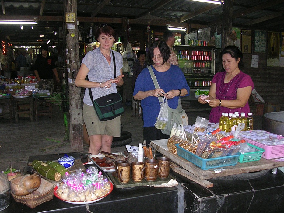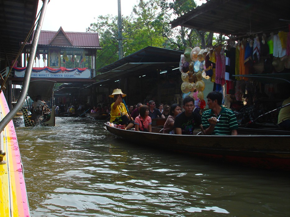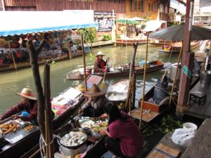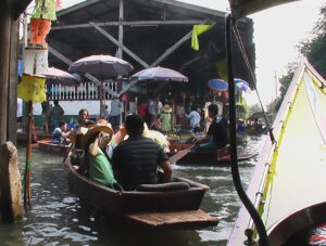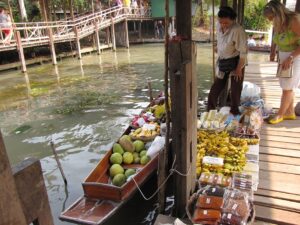 Wreszcie dopływamy do targu Floating Market Damnernsaduak. Wysiadamy z łodzi. Idziemy wzdłuż brzegu. Oglądamy sprzedawców i ich towary prezentowane na łodziach. Można tu kupić różnorodne produkty: warzywa, owoce, ryby, lokalne przysmaki, suweniry sprzedawane prosto z łodzi.