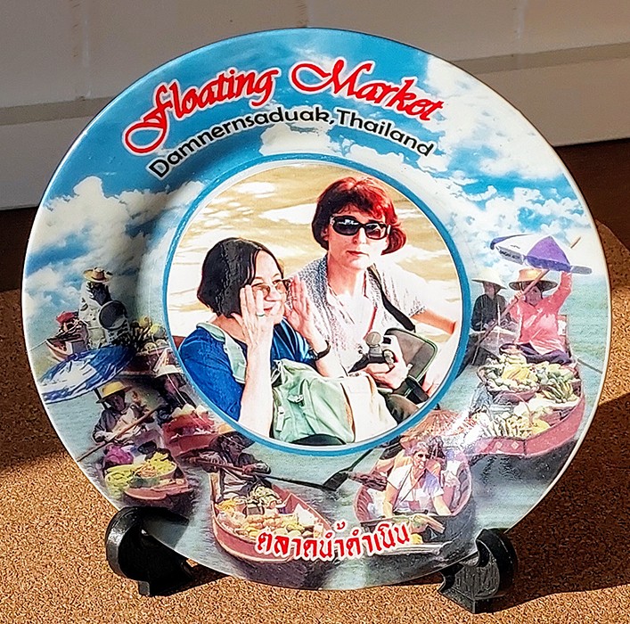 Kiedy wróciłyśmy na parking, w pobliżu naszego autokaru stał młody człowiek, a przed nim niewielkie talerzyki ze zdjęciami osób z naszej wycieczki umieszczone na specjalnych podpórkach. Robił on nam zdjęcia w momencie wsiadania do łodzi i podczas naszego spacerowania po targu fotki zostały ponanoszone na talerzyki. No cóż, kupiłam taki talerzyk, na którym jestem ja i Ewunia.
