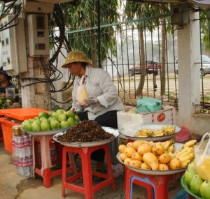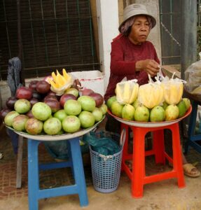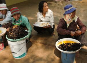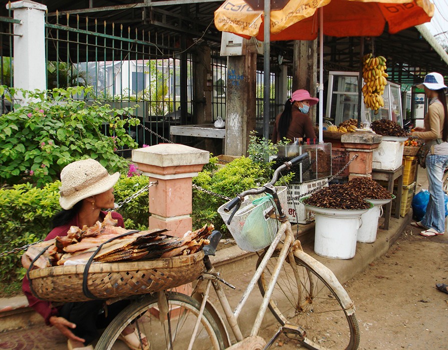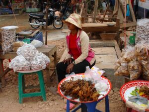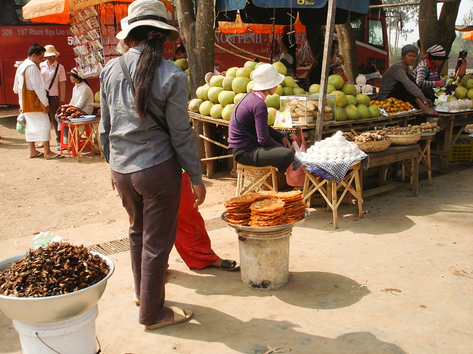 Specjalną atrakcją kulinarną dla turystów są smażone na głębokim tłuszczu szarańcza i tarantule – duże czarne pająki. Kupiłam porcję szarańczy – chrupiąca, smakiem przypominała prażone orzeszki. Mimo moich zainteresowań nieznanymi produktami spożywczymi nie odważyłam się spróbować tarantuli.