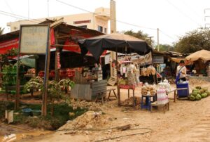Oprócz stacjonarnych obiektów handlowych jest też wiele stoisk „naziemnych”. Ich właściciele siedzą na stołeczkach, a czasem wprost na ziemi otoczeni oferowanym towarem.