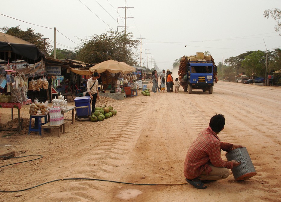 Route 33 jest w Kambodży kluczowym szlakiem komunikacyjnym dla podróżnych i handlu. Tą drogą poruszają się turyści zmierzający do Angkor Wat – największego kompleksu świątynnego na świecie. Wyrosły przy niej rozliczne niewielkie biznesy: maleńkie sklepiki, rozmaite stragany, w których można zaopatrzyć się we wszystko, co potrzebne w podróży: żywność, napoje, jakiś sprzęt do naprawy pojazdów, akcesoria samochodowe i motocyklowe, a także benzynę sprzedawaną w plastikowych butelkach takich jak do wody mineralnej… Można tu kupić inne niezbędne przedmioty do domu i ogrodu. Był też całkiem okazały pawilon oferujący domki duchów. Przy tych straganach niekiedy plączą się dzieci, śpią psy leniwie rozłożone w słońcu.