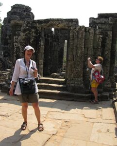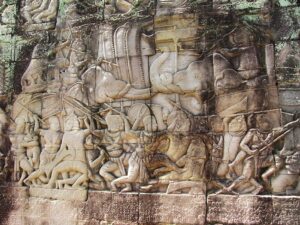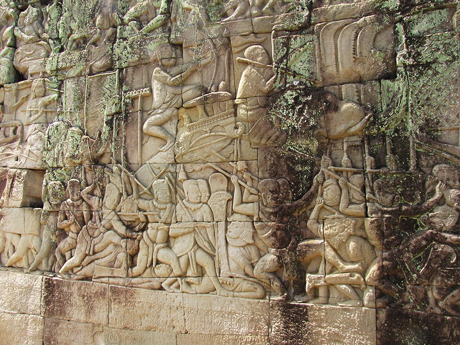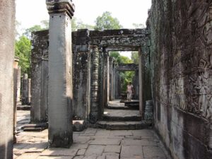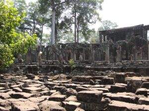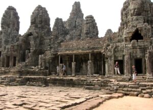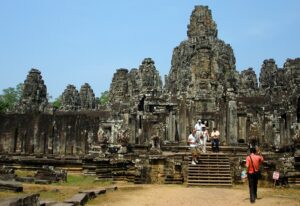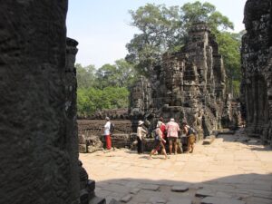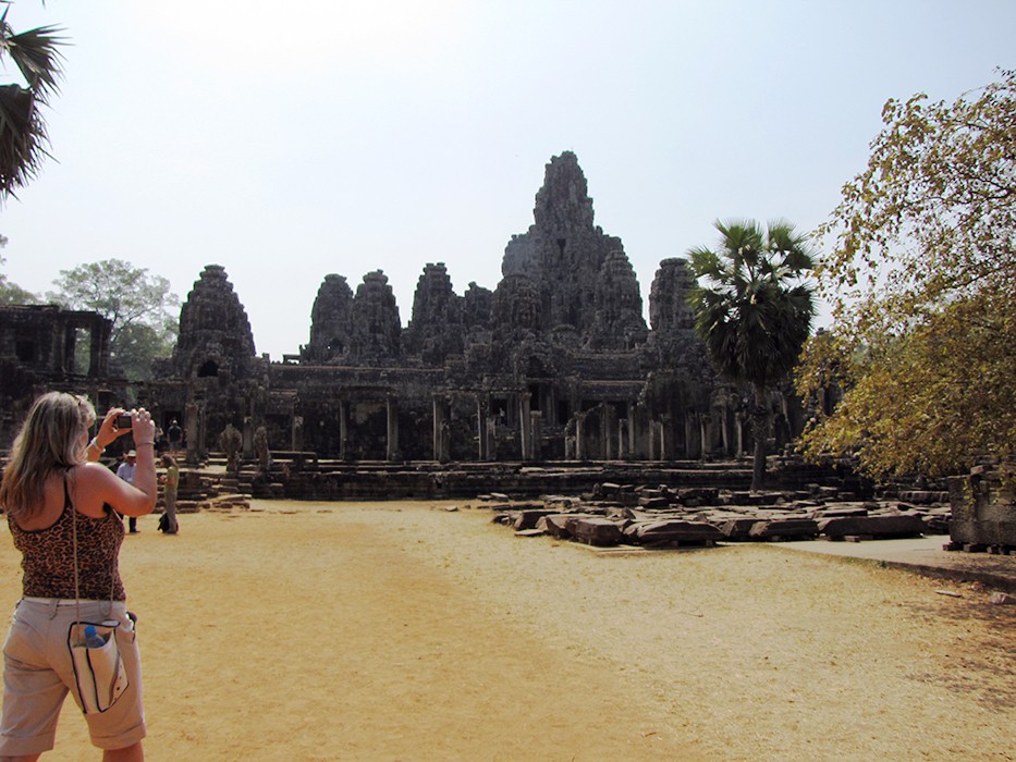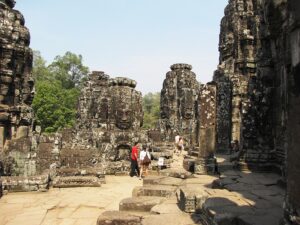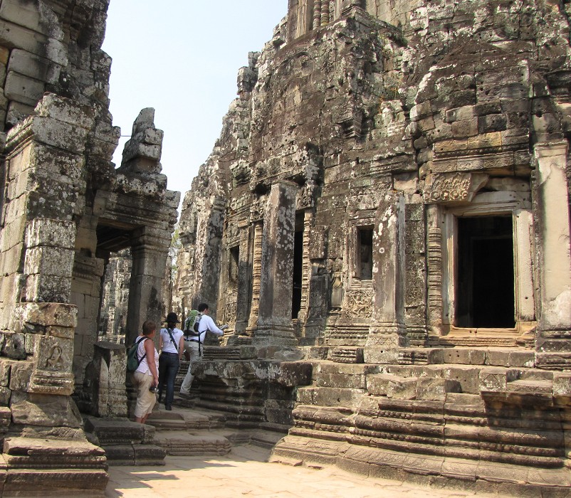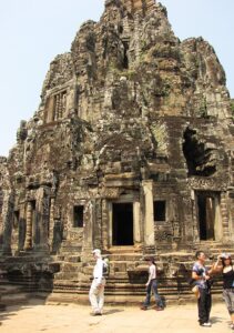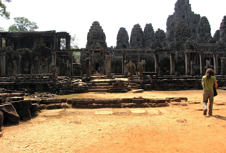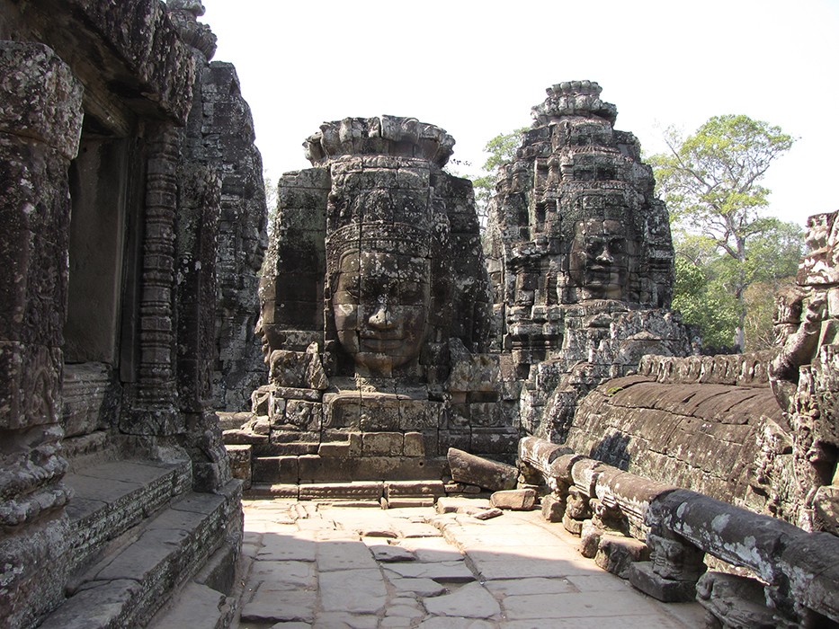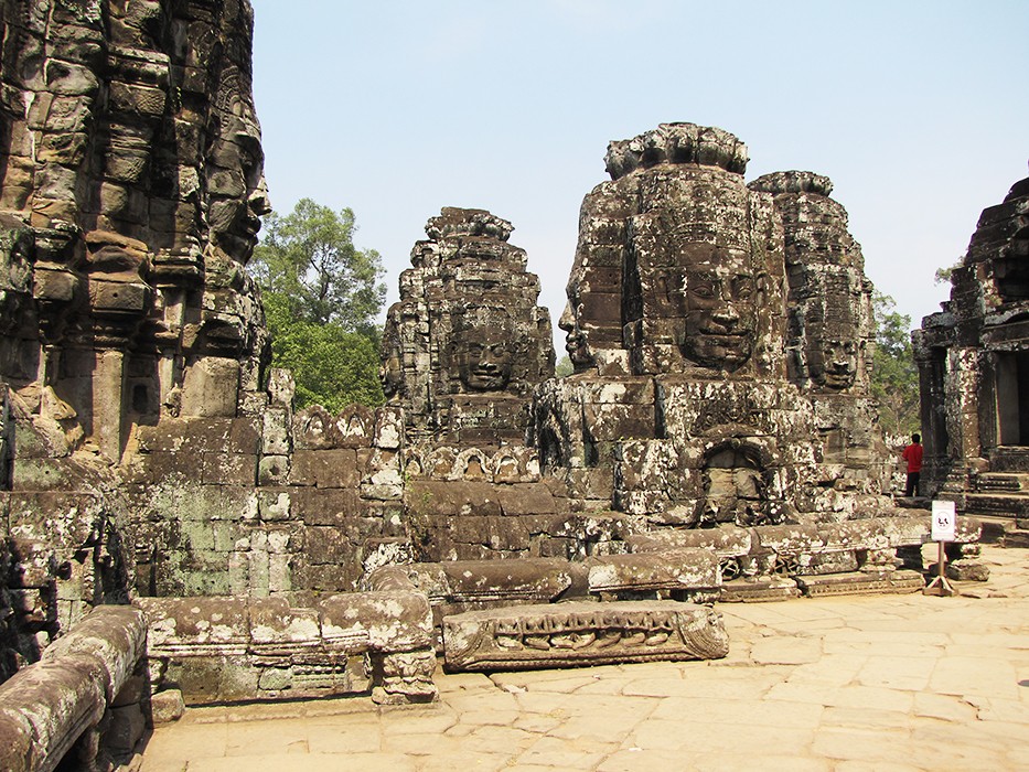 Pierwszym punktem zwiedzania ruin tego niegdyś wspaniałego miasta jest świątynia Bayon. Niesamowite wrażenie sprawiają te wszechobecne ogromne twarze. Trudno sobie wyobrazić, jak wyglądało ich tworzenie. Ilu to ludzi musiało wspinać się po tych kamiennych murach i ręcznie wykuwać ich oczy, ich łagodnie uśmiechnięte usta, misternie zdobione nakrycia głowy. Wspaniałe są też płaskorzeźby gęsto pokrywające ściany galerii.