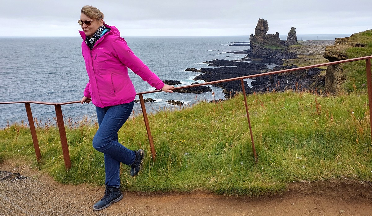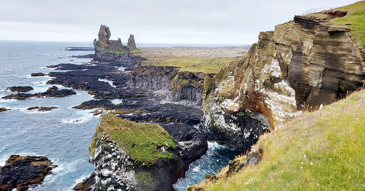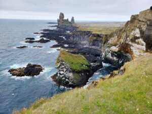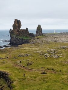 Zatrzymaliśmy się w Londrangar, by oglądać wspaniałe formacje skalne. Dwa potężne bazaltowe filary wyglądają jak zamczysko wyrastające z oceanu otoczone klifami i polami lawowowymi. Wyższa wieża ma 75 metrów, niższa 61 metrów. To fragmenty dawnego krateru, który uległ erozji. Według islandzkich legend są to tereny należące do elfów.